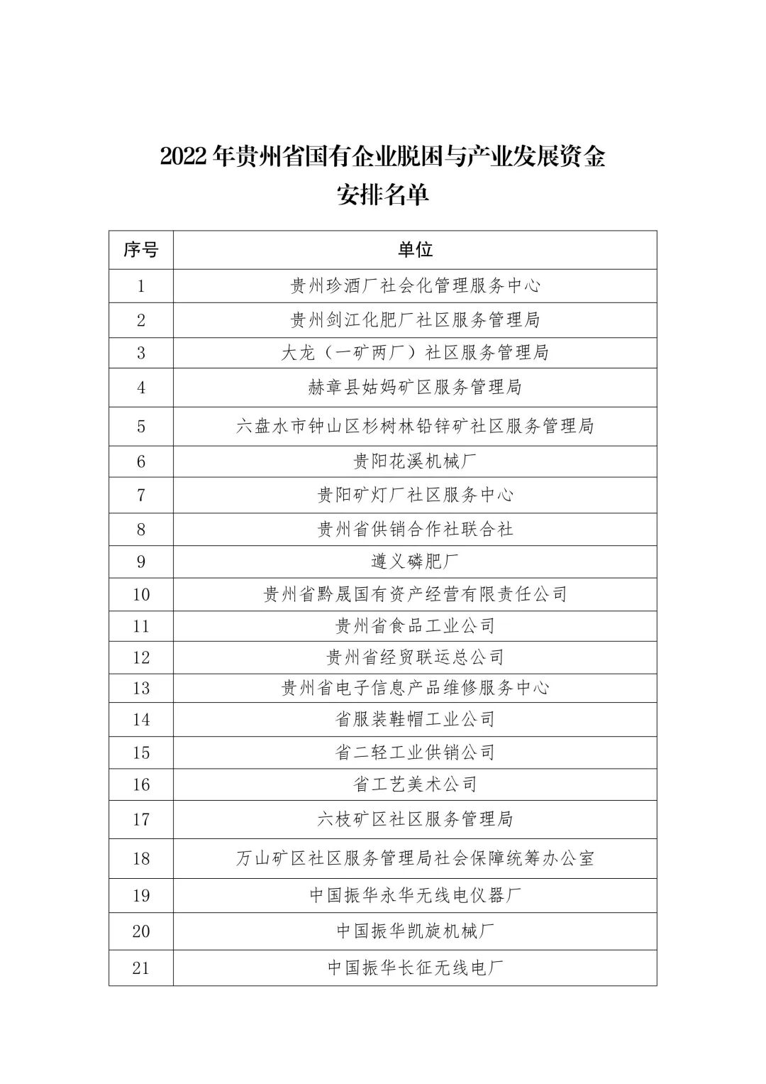 根据《省财政厅关于下达2022年国有资本经营预算资金的通知》(黔财预〔2022〕12号)要求,省工业和信息化厅会同省财政厅、省住房和城乡建设厅、省人力资源和社会保障厅、省国资委、省总工会、省委老干局等部门,本着尊重历史、实事求是、认真审核的原则,对申报企业开展审核认定工作,形成了2022年贵州省国有企业脱困与产业发展资金安排名单,现向社会予以公示(见附件),公示时间为2022年4月25日-2022年4月29日。公示期间,如有异议,请以书面方式反馈至贵州省工业和信息化厅产业政策与法规处,同时提供相关证明材料,联系电话:0851-86824942。