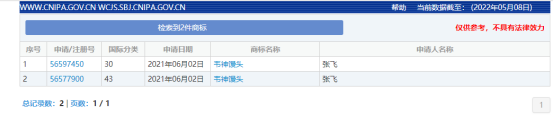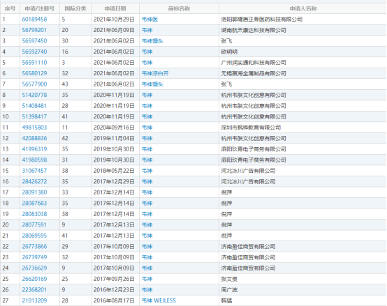 通过商标局查询发现,韦东奕的相关商标已经被人抢注。其中,“韦神”商标已经被济南与杭州两家公司注册成功,“韦神馒头”商标已被个人申请注册成功。“韦东奕”“韦神凉白开”商标状态均为驳回待复审。
