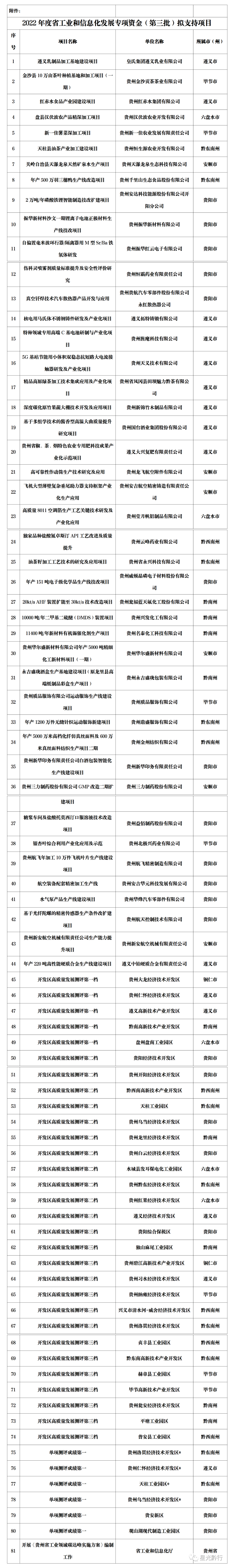 根据《省工业和信息化厅关于做好2022年省级财政专项资金入库项目补充完善申报材料工作的通知》文件要求,经自愿申报、地方推荐、项目评审等程序,拟支持皇氏集团遵义乳业有限公司遵义乳制品加工基地建设项目等81个项目,现予公示(见附件)。公示期为2022年6月13日-6月17日。公示期间,如有异议,请及时与省工业和信息化厅联系,联系电话:0851-86826959。