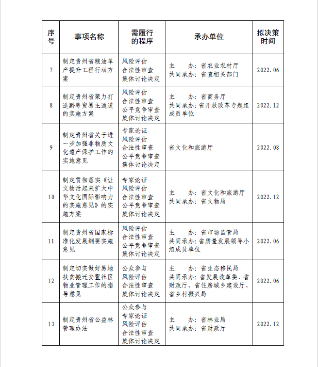 根据《重大行政决策程序暂行条例》《贵州省重大行政决策程序实施办法》规定,经省委、省人民政府同意,近日,省政府办公厅印发《贵州省人民政府2022年度重大行政决策事项目录》,并就有关工作通知如下: