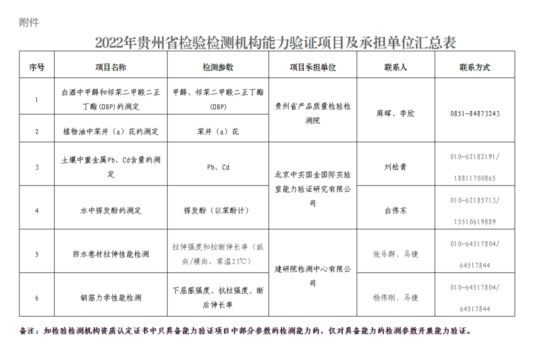 附件:2022年贵州省检验检测机构能力验证项目及承担单位汇总表