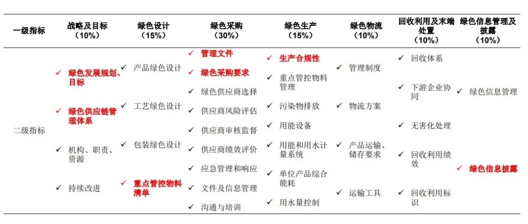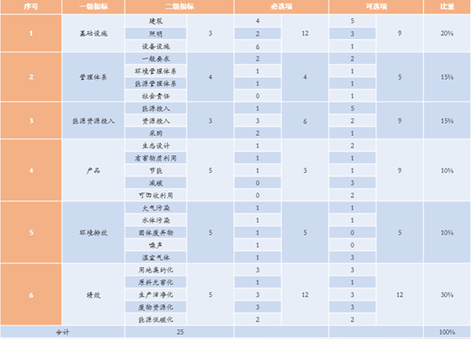 4.产品评价方面,主要包含材料的选用上、种类要集中,可回收程度高;采用标准化设计,提高产品的使用周期;在整个生产流程中对碳足迹进行跟踪等