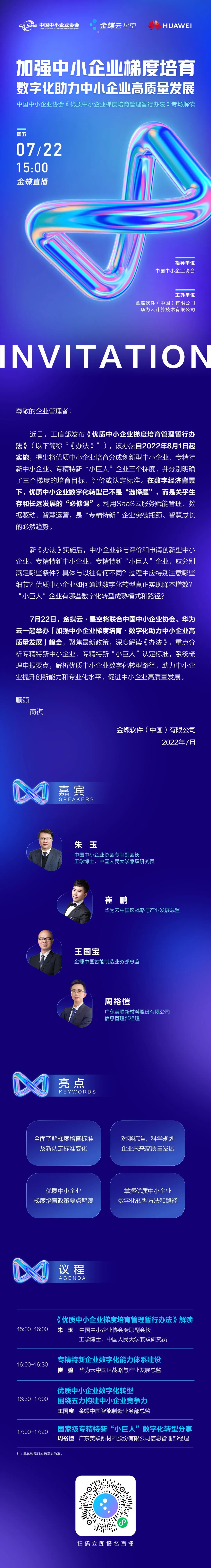 7月22日(周五)下午15:00,中国中小企业协会专职副会长 朱玉,专业解读《优质中小企业梯度培育管理暂行办法》,敬请期待,欢迎收看。