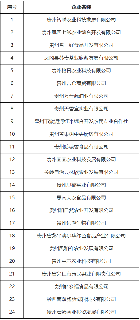 根据《贵州省农业产业化省级龙头企业认定和运行监测管理办法》规定,省农业农村厅组织开展第十二批农业产业化省级重点龙头企业认定工作,经企业申报、市县推荐、专家评审,征求省级重点龙头企业联席会议成员单位意见,省农业农村厅厅长办公会研究同意,认定贵州黄果树中央厨房有限公司等24家企业为农业产业化省级重点龙头企业。现将新认定企业名单予以公示,公示期为5个工作日(2022年8月9日—15日)。