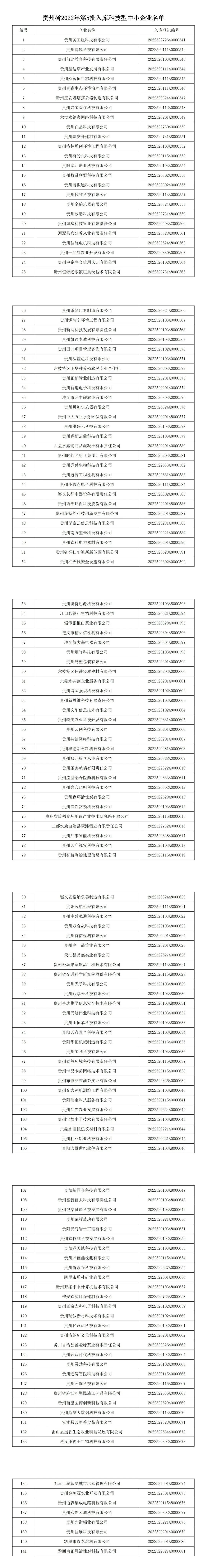 根据《科技型中小企业评价办法》(国科发政〔2017〕115号)、《科技型中小企业评价服务工作指引》(国科火字〔2022〕67号)及《关于做好2022年科技型中小企业评价服务工作的通知》(国科火字〔2022〕68号)有关要求,经公示通过,现将贵州省2022年第五批入库的141家科技型中小企业名单予以公告。