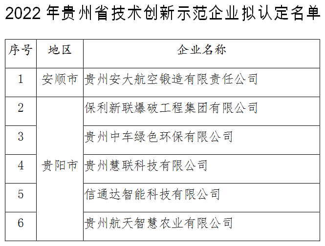 根据《省工业和信息化厅关于组织开展2022年省级技术创新示范企业认定工作的通知》,经企业自主申报、各市(州)推荐、专家评审、现场考察、综合审查,拟认定贵州安大航空锻造有限责任公司等6家企业为贵州省技术创新示范企业。