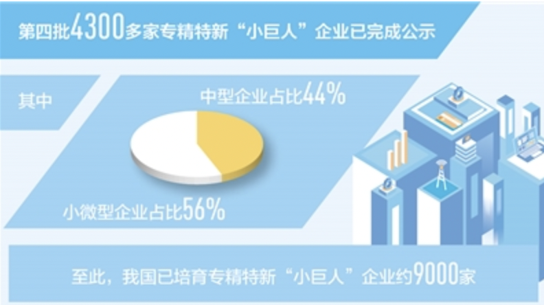 记者从工业和信息化部日前举行的“新时代工业和信息化发展”系列新闻发布会上获悉:第四批4300多家专精特新“小巨人”企业已完成公示,在完成认定程序后将正式发布。至此,我国已培育专精特新“小巨人”企业约9000家。