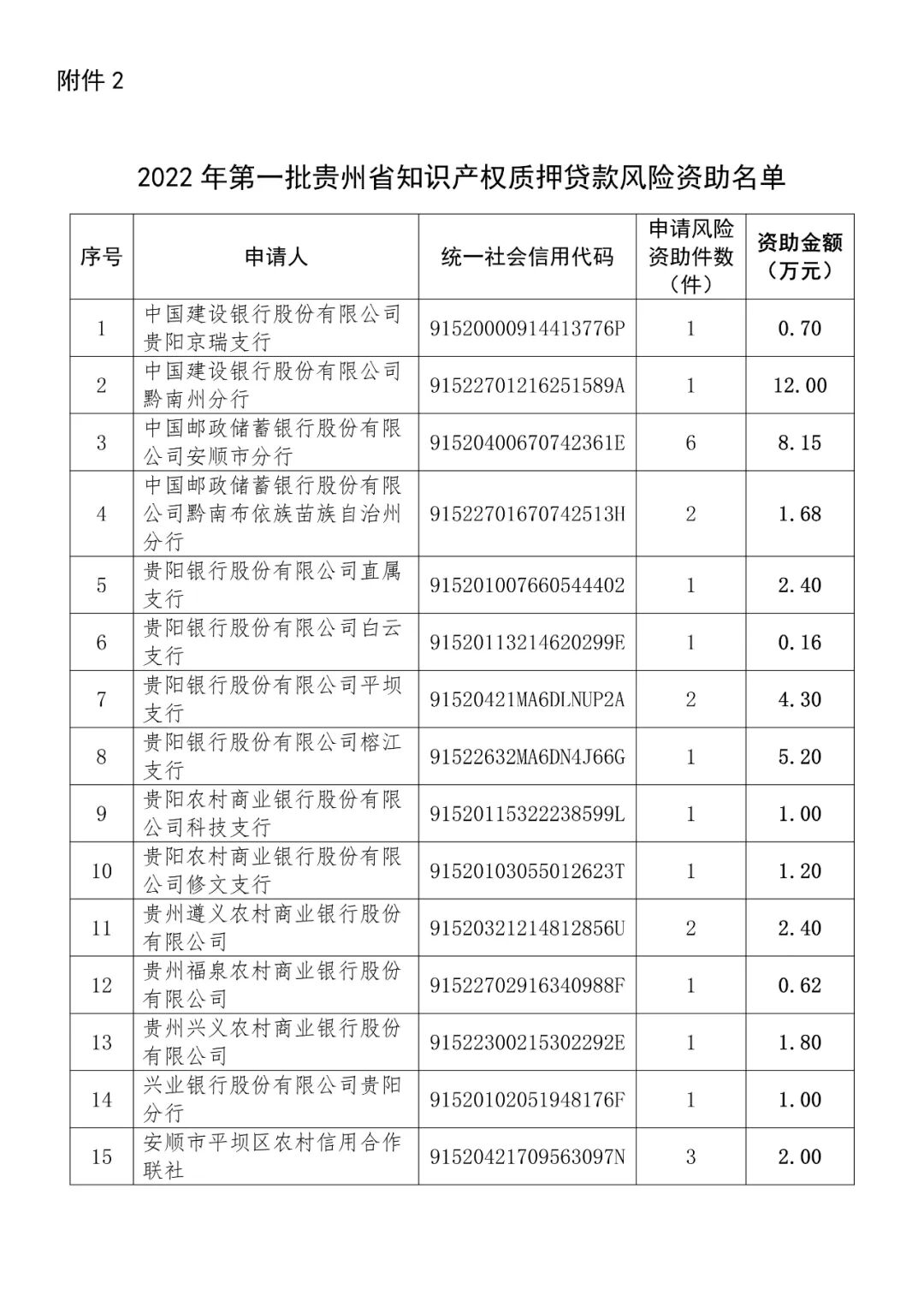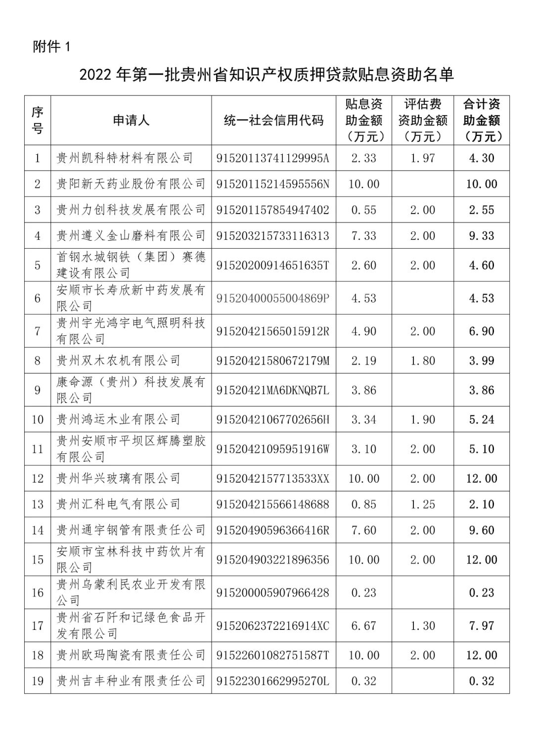1.2022年第一批贵州省知识产权贷款贴息资助名单