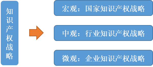 企业涉及的知识产权类型包括:专利权、商标权、著作权及商业秘密等,因此,企业的知识产权战略可以按照知识产权的基本类型进行划分,如下图所示: