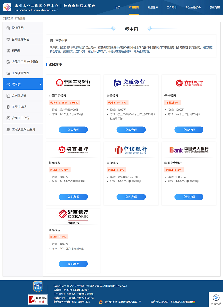 11月11日,贵州省公共资源交易综合金融服务平台(简称“省金服平台”)上线的政府采购中标融资贷款服务(简称“政采贷”)正式投用,来自贵州银行、招商银行、浙商银行、建设银行等多家银行的政采贷产品可供选择。