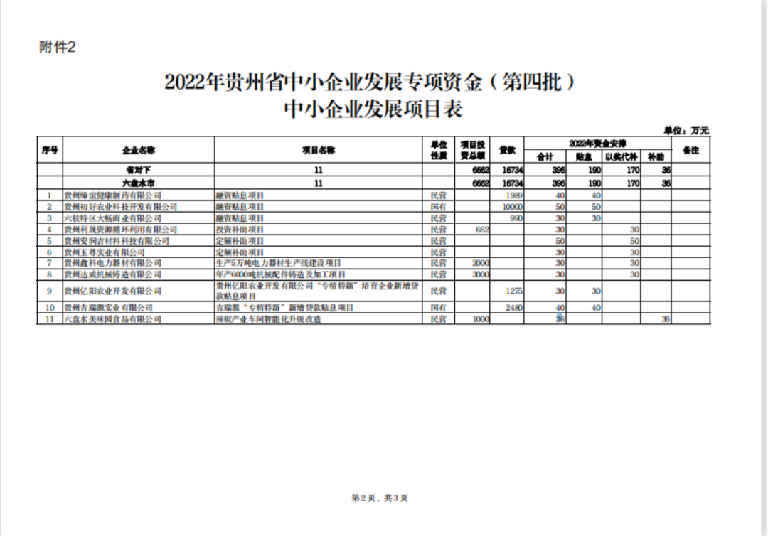 12月2日,由我平台指导申报的贵州玉尊实业有限公司、六盘水美味园食品有限公司成功获得2022年第四批贵州省中小企业发展专项资金,金额共计:66万元。