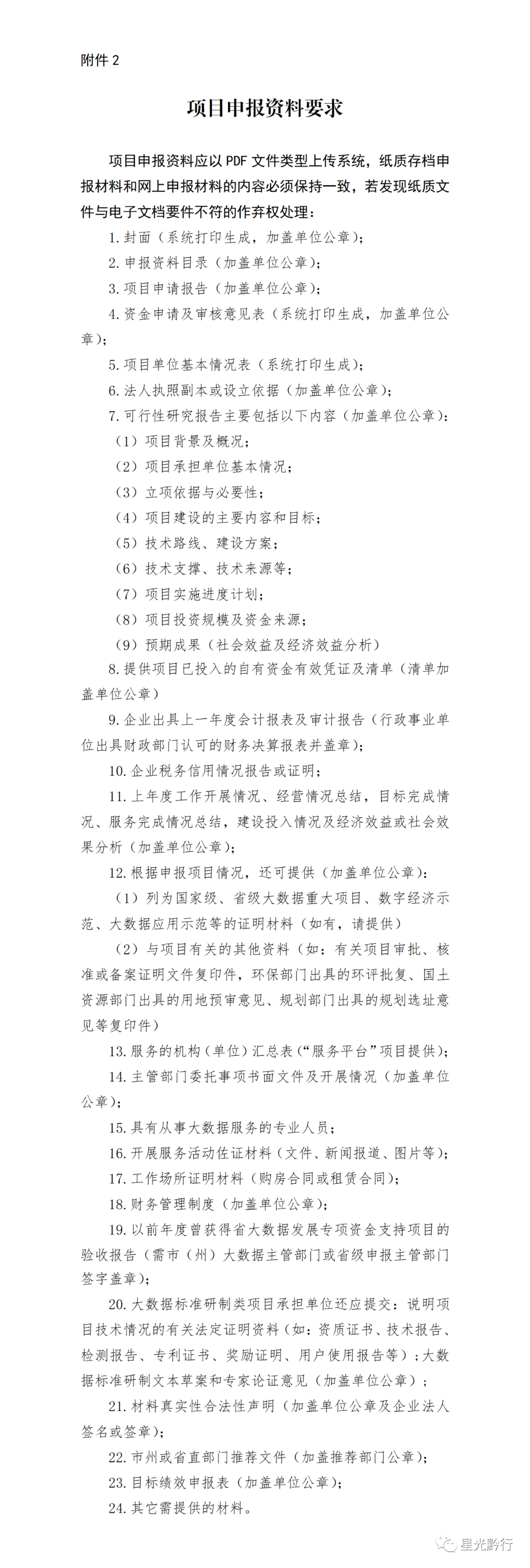 为贯彻落实党的二十大精神和省第十三次党代会精神,深入实施数字经济发展战略,加快建设数字经济发展创新区,根据《贵州省大数据发展专项资金管理办法(2021修订版)》(黔财工〔2021〕49号)、《贵州省省级预算项目库管理办法(试行》(黔财编〔2021〕5号)相关规定,做好2024年度省大数据发展专项资金(以下简称“专项资金”)预算项目储备工作,现将有关事项通知如下:(一)突出重点领域。抢抓新国发2号文件政策机遇,紧扣数字经济发展创新区定位,优先支持国家和省委、省政府确定的大数据领域重点项目。(二)突出项目建设。坚持“产业为先、项目为王、效益为本”,以项目建设带动有效投资,培育壮大市场主体,督促项目安全建设和生产,推动项目建设提质增效,优先支持纳入“项目建设年”重点项目库的项目。(三)突出绩效导向。项目建设内容应明确、具体,绩效目标需指向清晰、细化量化、合理可行,充分发挥绩效目标引导和约束作用。(四)突出科学公开。注重项目事前审核把关、事中过程跟踪、事后绩效评价等全过程管理,严格履行政府采购相关规定,相关资金信息按程序公开并接受监督。2024年专项资金主要采取以奖代补、购买服务等方式安排。项目单位通过登录贵州省大数据发展管理局网站(http://dsj.guizhou.gov.cn),点击“贵州省大数据项目管理平台”链接,登入“贵州省大数据发展专项资金(基金)项目管理系统”进行网上填报。(一)逐级申报。各级大数据主管部门按照“谁申报、谁审核、谁负责”的原则组织辖区项目申报,并进行初审,确保申报项目的真实性和申报要件的合规性、完整性,提出审查意见后逐级报省大数据局。(二)直接申报。以下情形,可由申报单位直接向省大数据局申报:(1)中央在黔单位;(2)省有关部门、直属机构、省属企事业单位;(3)被省大数据局纳入省级示范平台、示范园区、省级重点企业、省级重点项目的承担单位;(4)由基金管理人推荐的重点拟投资企业。(三)申报时间。本次集中申报截止日期为2023年5月30日。(一)申报主体。应具备独立法人资格,在贵州省内注册1年以上,未被列入贵州“信用云”黑名单。(二)申报金额。项目申报金额应和总投资挂钩,不高于项目总投资30%。(三)项目建设期。申报项目应为在建项目或2023年开工项目,原则上项目完工时间应为2025年底前,部分重大项目完工时间可根据工作实际适当放宽。(四)其他。项目入库时应提供2022年度审计报告,资金下达前应提供2023年审计报告。各申报类别具体要求详见《2024年贵州省大数据发展专项资金项目申报指南》。(一)请各级大数据发展主管部门、有关省级部门指导辖内符合要求的项目单位进行申报,严格把关项目的可行性及申报资料的完整性、真实性,对项目进行筛选排序并出具推荐文件,项目汇总表需作为推荐文件附件(表格模板通过系统下载)。(二)请各市(州)、贵安新区大数据发展主管部门按照“项目申报和项目监督管理并重”的要求开展工作,各地项目资金拨付进度及验收工作情况将作为年度专项资金计划安排的重要参考。(三)获得资金安排的项目单位需配合做好项目监督管理、绩效评价、项目审计、项目验收等各项工作。(四)项目申报、审核过程中,各级大数据发展主管部门要严格遵守廉洁从政各项规定,严禁和杜绝任何违纪违法行为的发生。