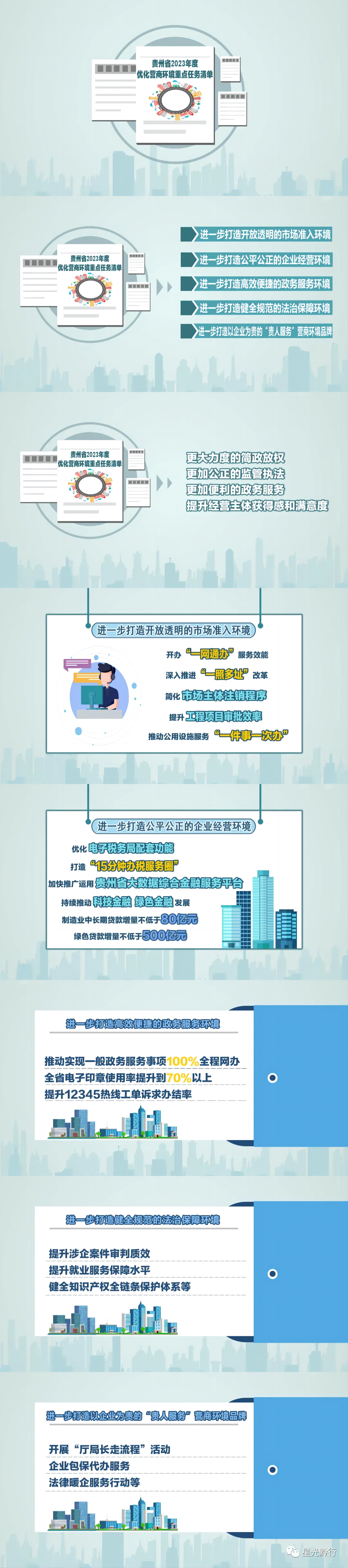 《贵州省2023年度优化营商环境重点任务清单》近日印发。将从进一步打造开放透明的市场准入环境、公平公正的企业经营环境、高效便捷的政务服务环境、健全规范的法治保障环境、以企业为贵的“贵人服务”营商环境品牌五个重点任务入手,以更大力度的简政放权、更加公正的监管执法、更加便利的政务服务,提升经营主体获得感和满意度。