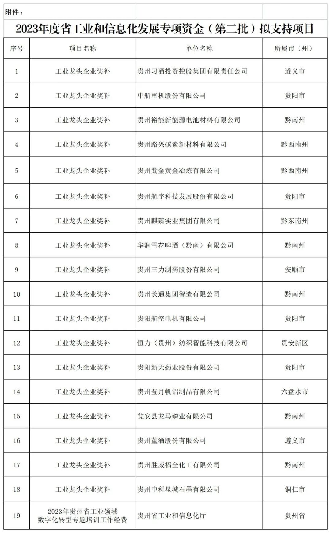 根据《省工业和信息化厅关于做好2023年省级财政专项资金储备项目入库申报工作的通知》文件要求,经自愿申报、地方推荐、项目评审等程序,拟支持中航重机股份有限公司等19个项目,现予公示(见附件)。公示期为2023年5月17日-5月23日。公示期间,如有异议,请及时与省工业和信息化厅联系,联系电话:0851-88668361。