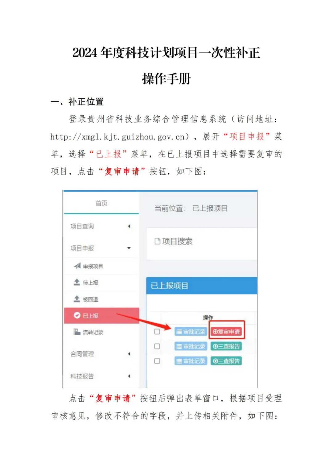 根据《省科技厅关于发布2023/2024年贵州省科技计划项目申报指南的通知》要求,我厅对申报2023/2024年科技成果应用及产业化计划(重大项目)、2024年科技成果应用及产业化计划(型号专项)的项目进行了形式审查,对符合要求的予以受理。形式审查不通过的将短信通知,项目申报单位可登录贵州省科技业务综合管理信息系统查询具体理由,如对形式审查结果有异议,可在2023年7月28日到8月3日17点通过贵州省科技业务综合管理信息系统向省科技厅提出申请复审,复审材料可一次性补正。具体操作可在“已上报”列表点击“复审申请”按钮进行操作(操作手册见附件)