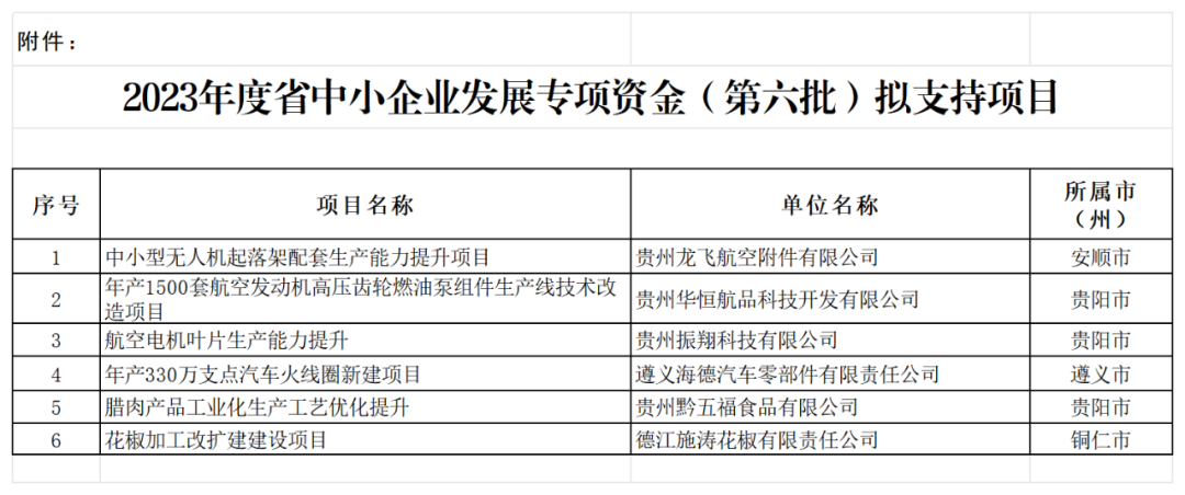 根据《省工业和信息化厅关于做好2023年省级财政专项资金储备项目入库申报工作的通知》要求,经自愿申报、地方推荐等程序,拟支持贵州龙飞航空附件有限公司中小型无人机起落架配套生产能力提升等6个项目,现予公示(见附件)。公示期为2023年12月11日-12月15日。公示期间,如有异议,请及时与省工业和信息化厅联系,联系电话:0851-88668175、88668174。