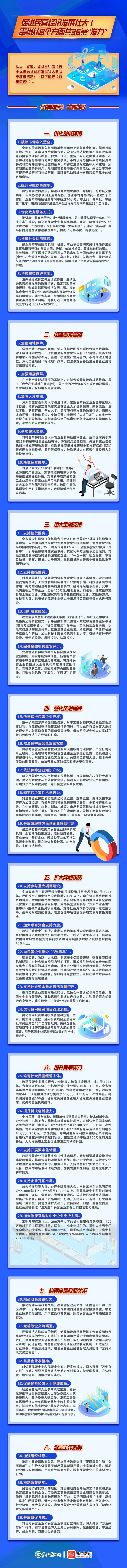 2024年1月26日,省委、省政府出台《关于促进民营经济发展壮大的若干政策措施》(黔党发〔2024〕5号),从优化发展环境、加强要素保障、加大金融支持、强化法治保障、扩大民间投资、提升竞争实力、构建亲清政商关系和健全工作机制8个方面制定了36条政策措施,促进民营经济发展壮大。