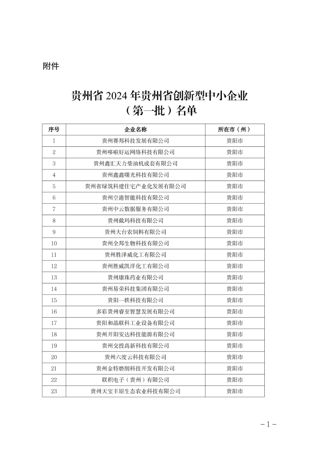 一、确认贵州赛邦科技发展有限公司等439家企业为2024年贵州省创新型中小企业(第一批)(名单见附件),自公布之日起,有效期三年。
