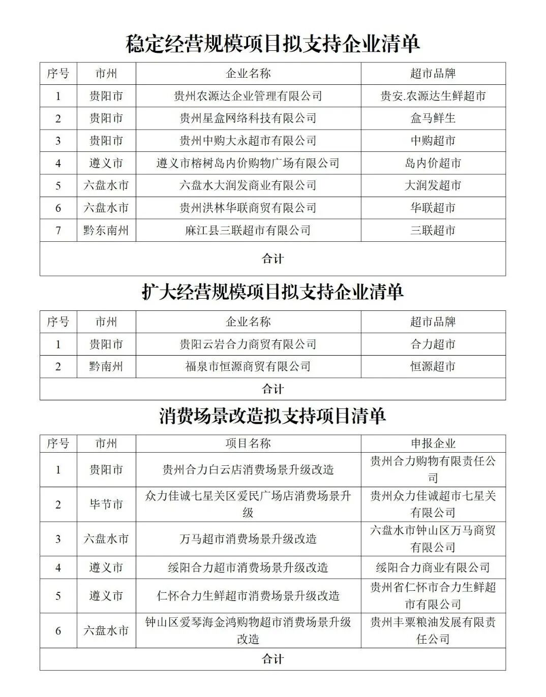 为贯彻落实《省商务厅等13部门印发<关于支持商超等实体零售发展的若干措施>的通知》要求,推动实体商超稳定和扩大经营规模,创新消费场景,经县级初审、市州审核推荐,省省商务厅组织专家评审,拟对贵州农源达企业管理有限公司等15个企业和项目给予奖补支持,现予公示,如有异议,请向省商务厅反馈。